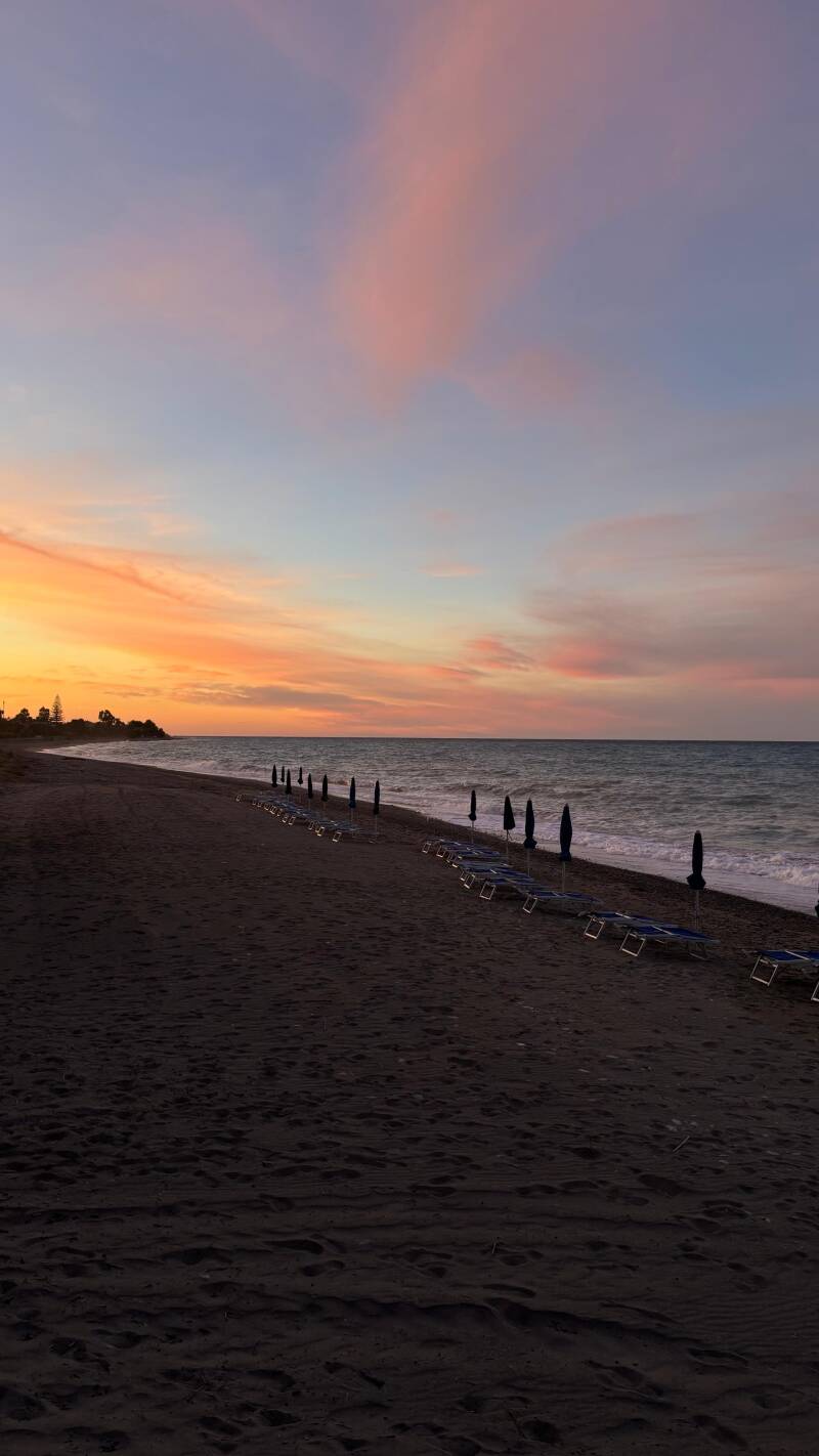 La struttura affaccia su un ampio tratto di spiaggia di sabbia e ciottoli, bagnata da un mare limpido che sfuma dall’azzurro al blu cristallino.